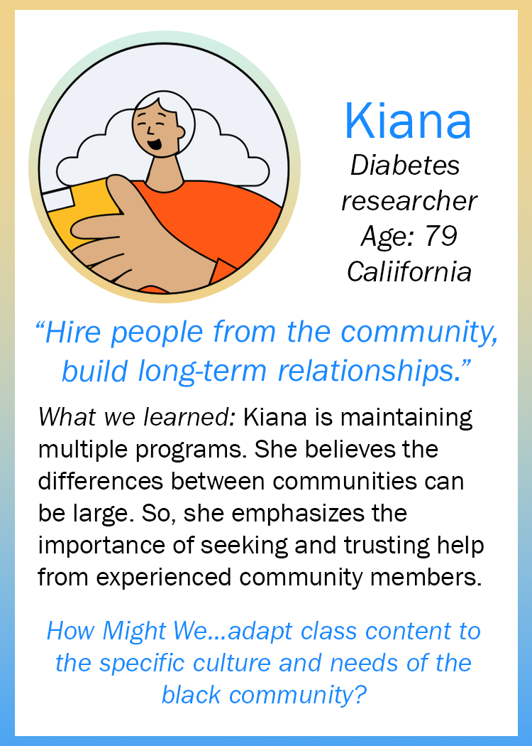 To better understand diabetes and how people feel about the HLWD program, we conducted 17 interviews with various stakeholders, including: pre-diabetics, diabetics, medical practitioners, HLWD facilitators and participants, etc.