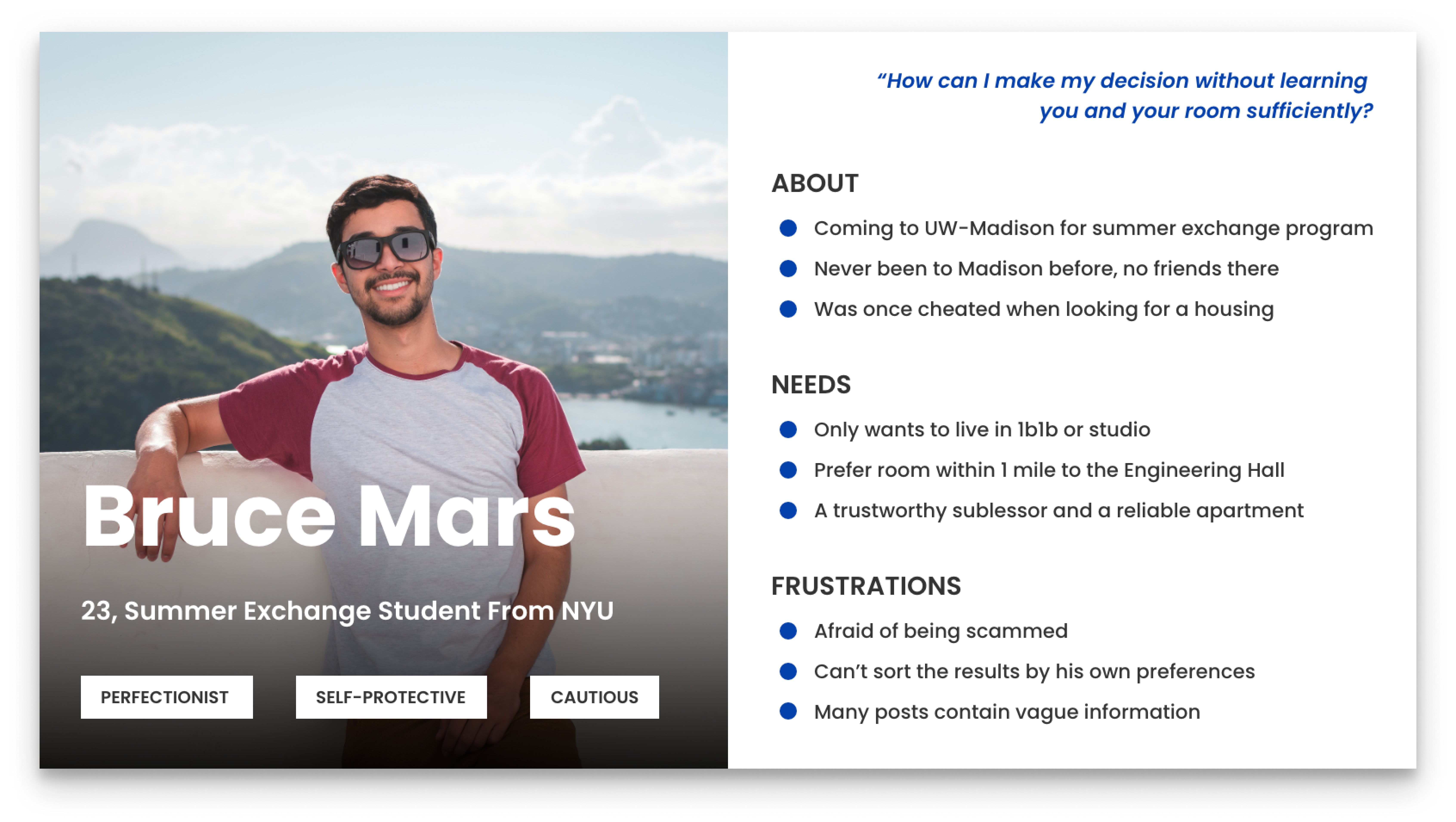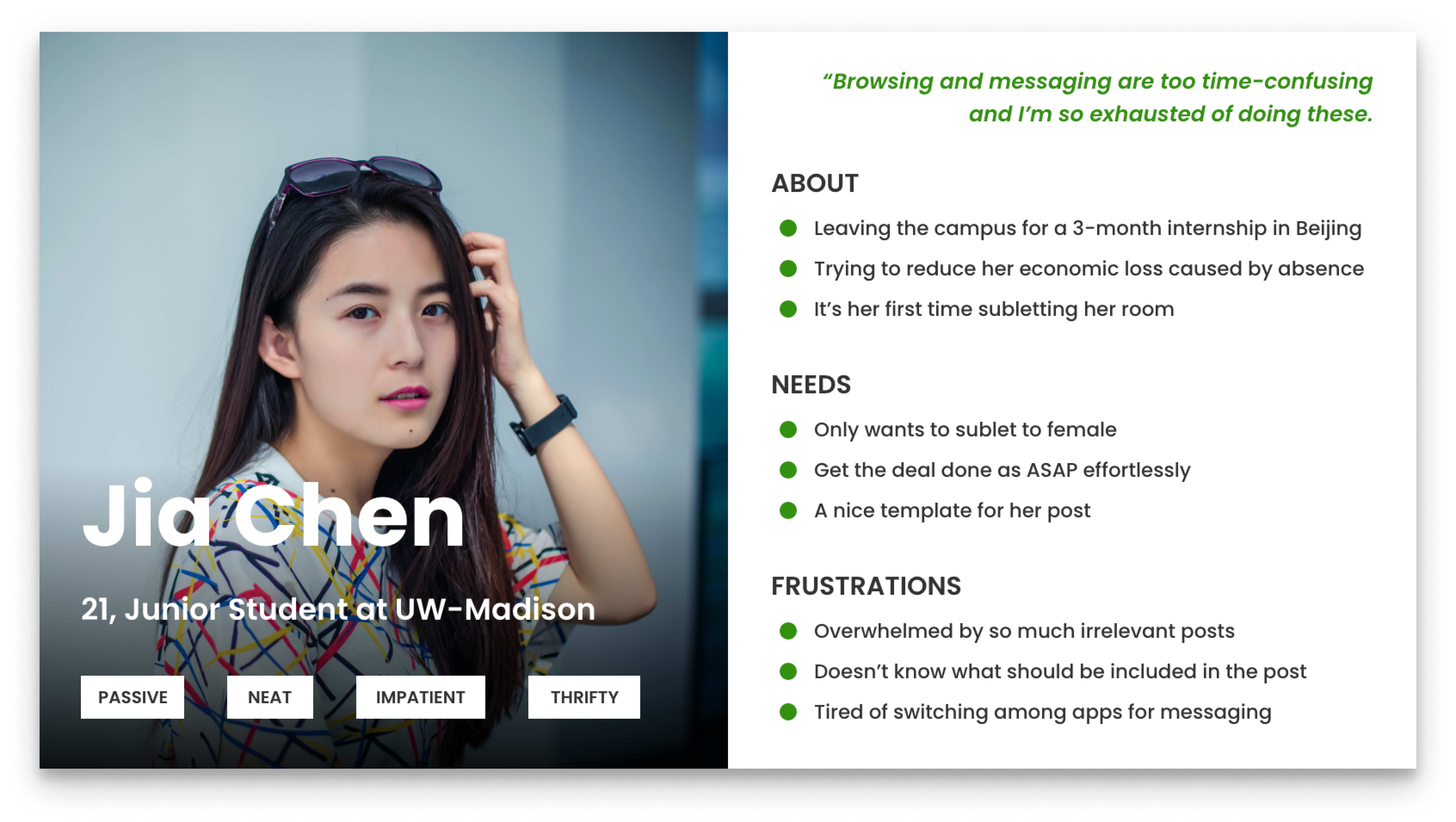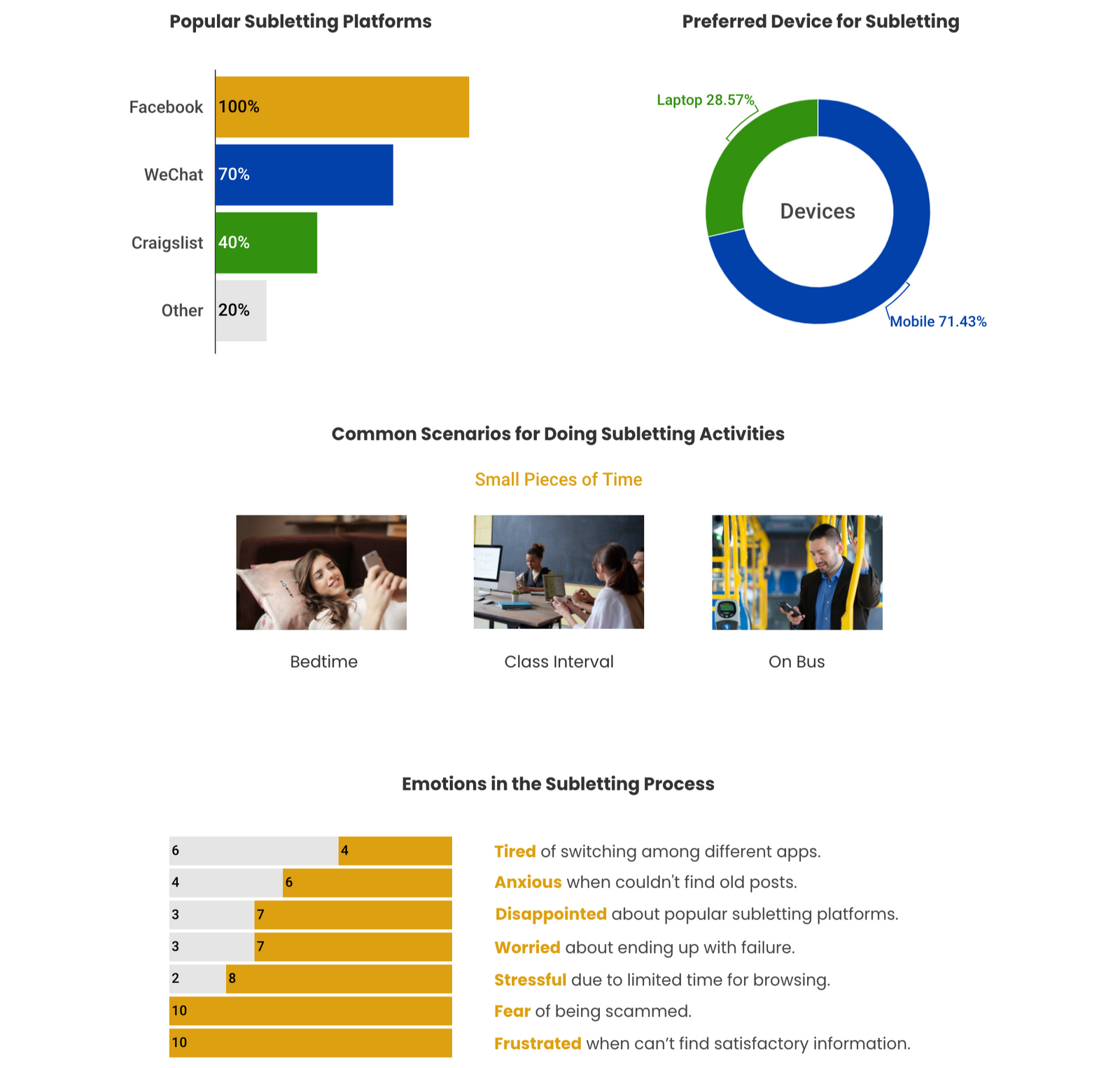 To better understand the problems, we interviewed 10 students about challenges they had encountered during the subletting process. In the meanwhile, we also asked them to show us the steps they would take if they were going to sublet or look for rooms.