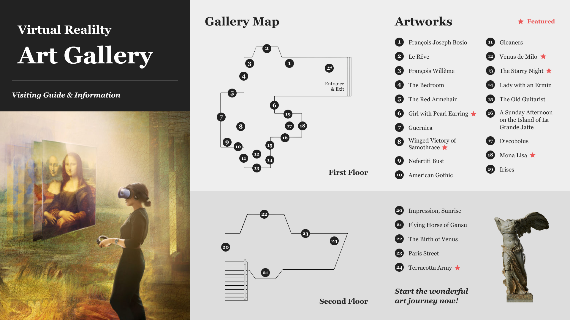 To make it easier for users to navigate in our gallery, we created a tour guide and highlighted our featured artworks on it. Then, we placed a button on the screen for opening the brochure so that users can look at it at any time anywhere in the gallery.