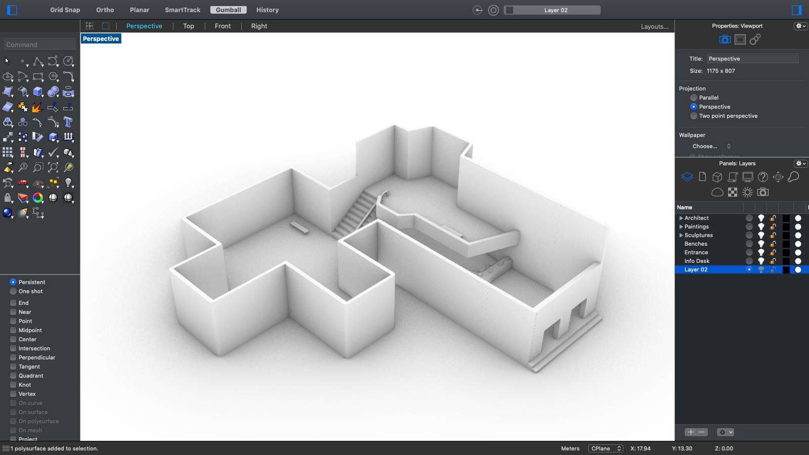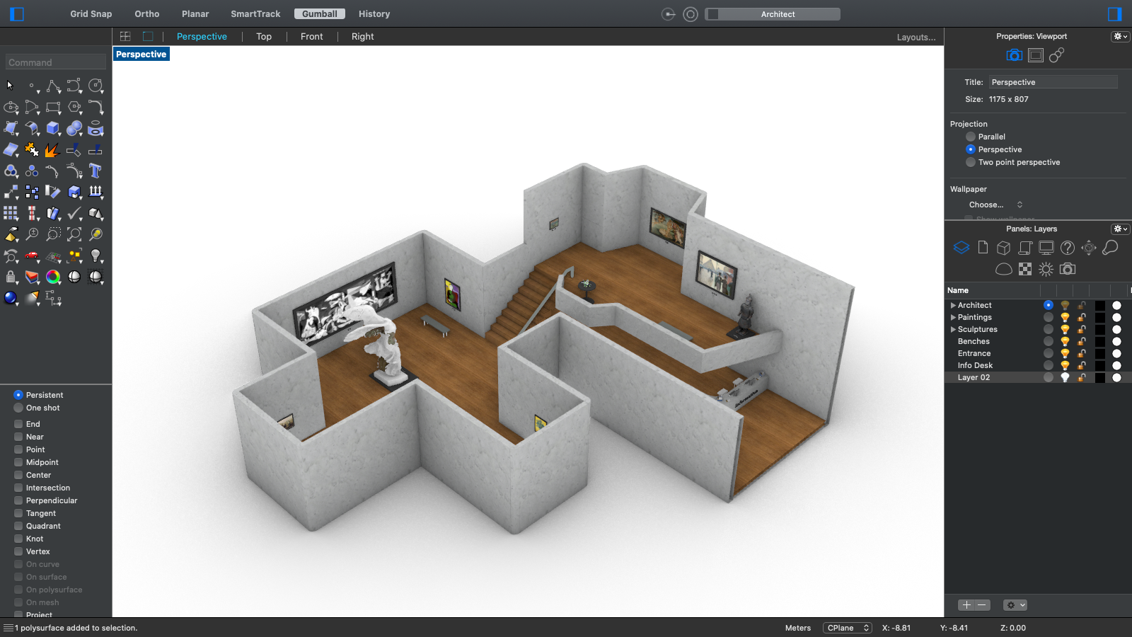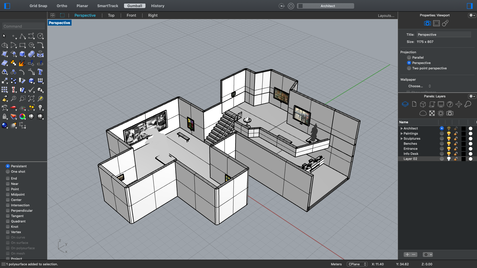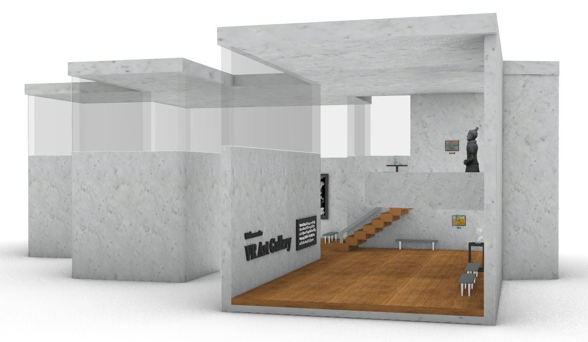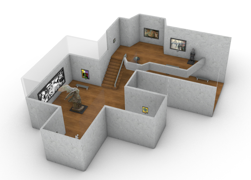 We designed and created all the 3D models from scratch in Rhino. Objects we made include: the gallery structure, frames of paintings, sculpture bases, benches, computers and so on.